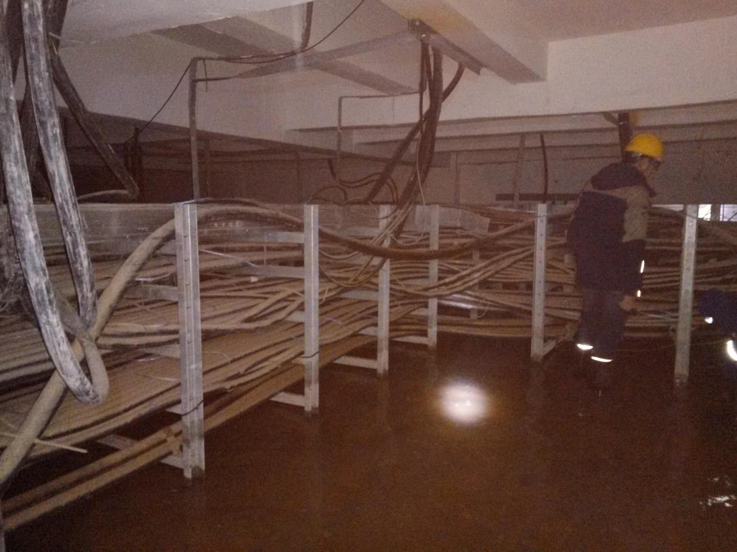 完全科技技術(shù)人員趕到現(xiàn)場,發(fā)現(xiàn)前期使用防火泥、發(fā)泡膠處理的穿墻管孔封堵已基本失效,電纜夾層嚴(yán)重積水,橋架及電纜浸泡在水中,金屬構(gòu)件出現(xiàn)嚴(yán)重銹蝕,上層變電站環(huán)網(wǎng)柜體長期受電纜夾層潮濕空氣侵蝕,出現(xiàn)銹蝕,柜體內(nèi)凝露嚴(yán)重。
